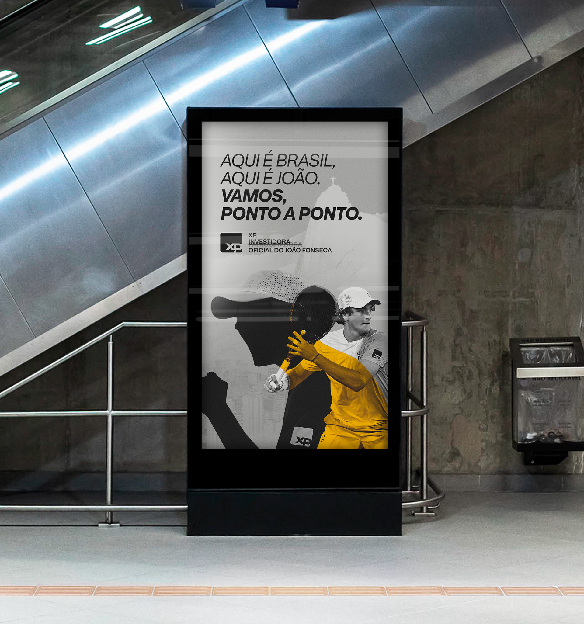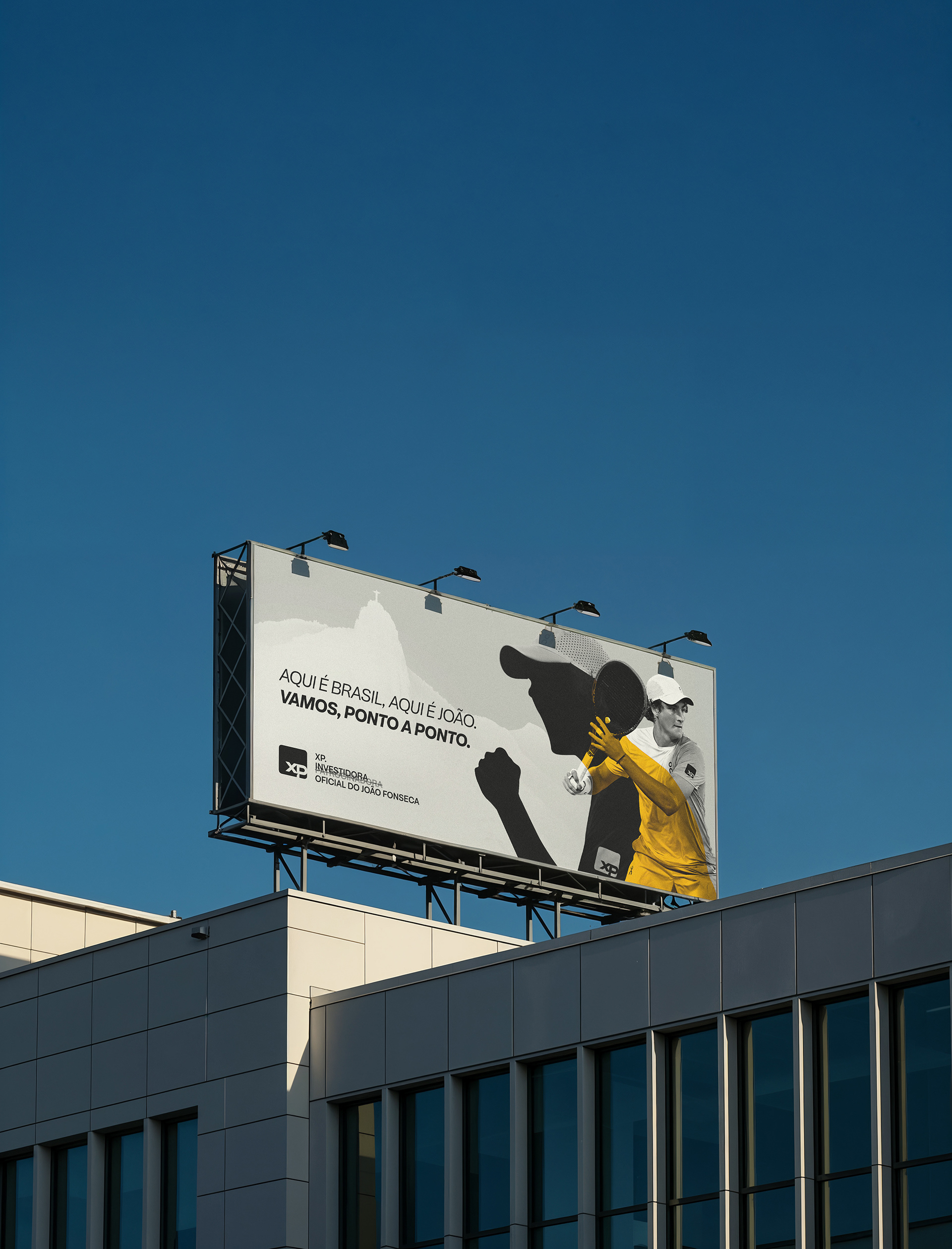 Como primeira ativação de torcida, lançamos o boné XP + ON para o Rio Open, distribuído aos clientes XP como acessório oficial dos fãs do João. Durante o torneio, a mensagem extrapolou as quadras por meio de OOH, mídia impressa, aeroportos e redes sociais.